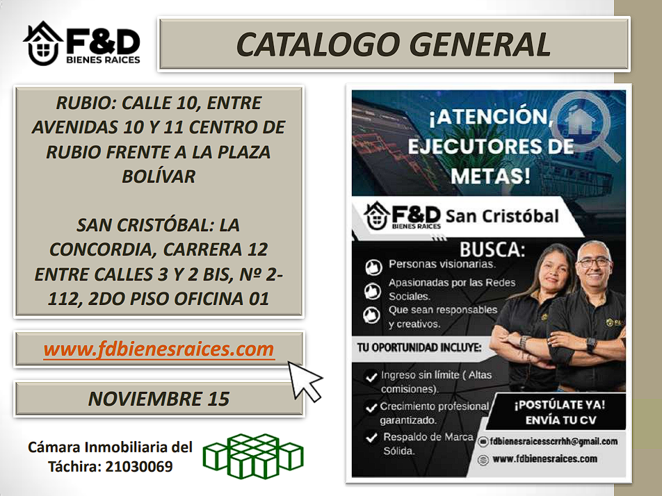 F&D Bienes Raices Inmobiliaria en Rubio y San Cristóbal esta buscando talentos como el tuyo, para formar parte de una de nuestras oficinas, escribe y recibe más información!